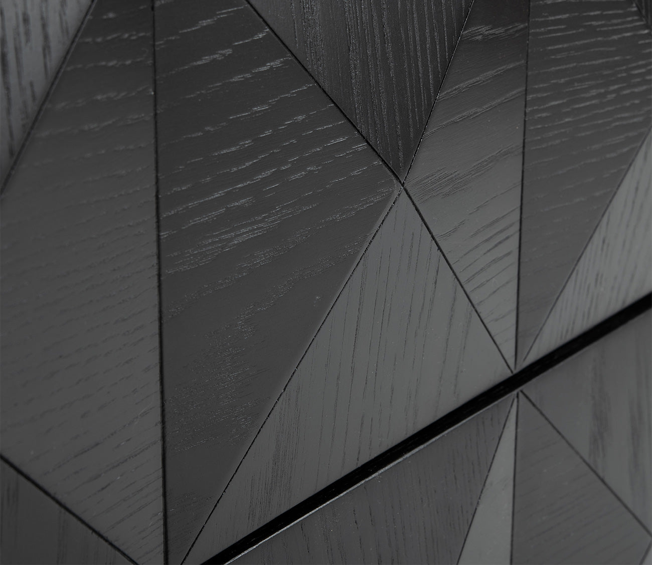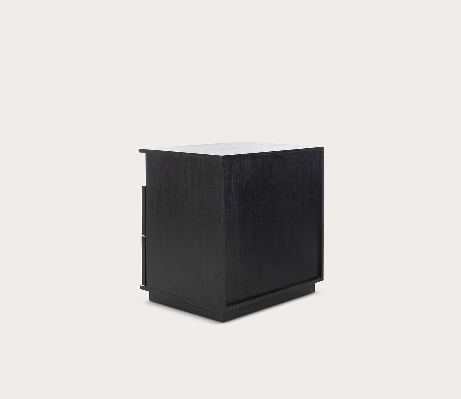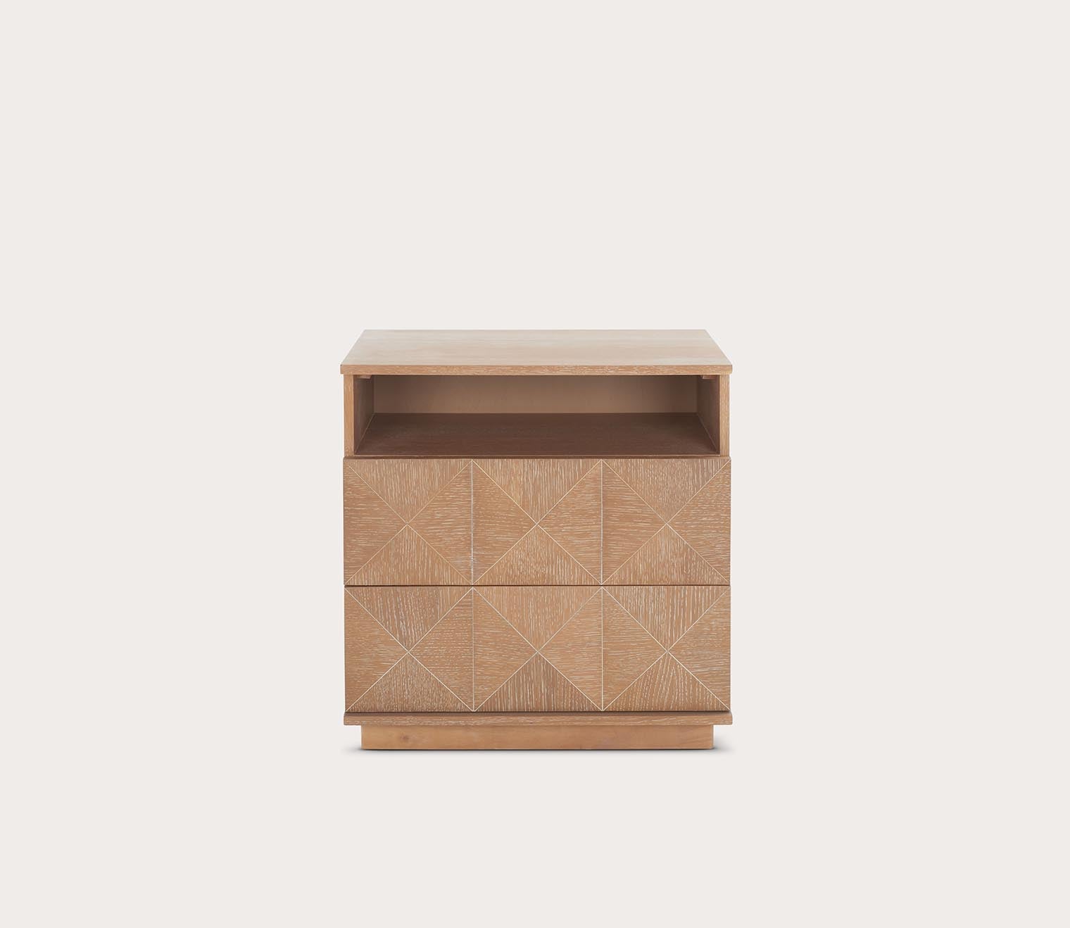 A solid wood two-drawer nightstand featuring bold geometric detailing, available in black, walnut, or natural finishes for a modern yet timeless bedside accent.