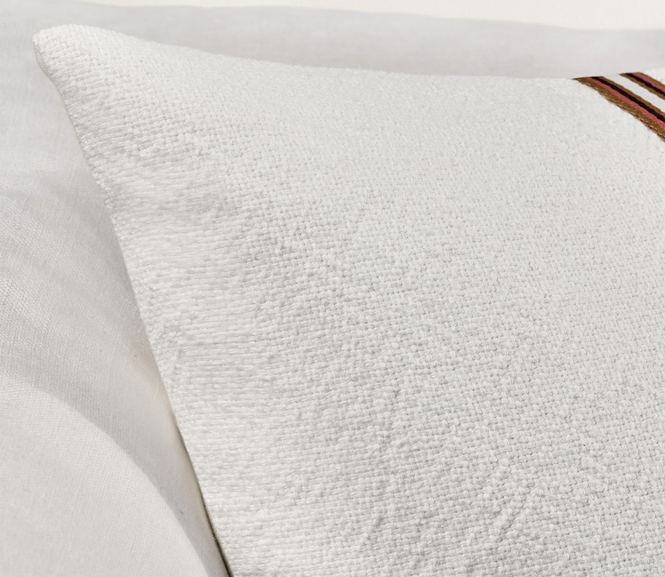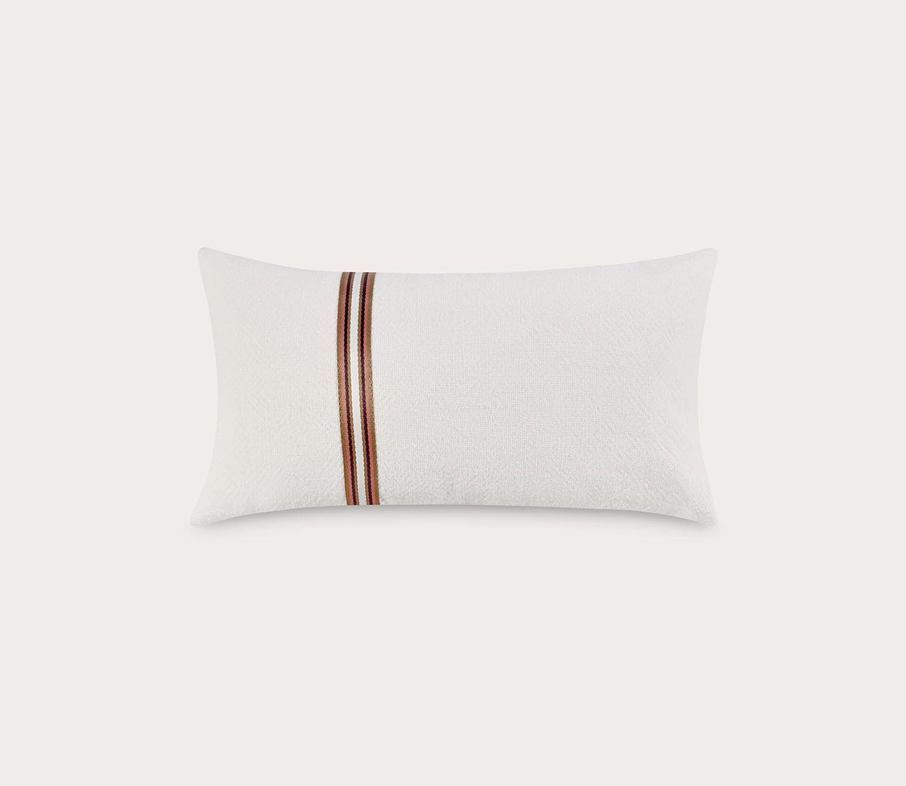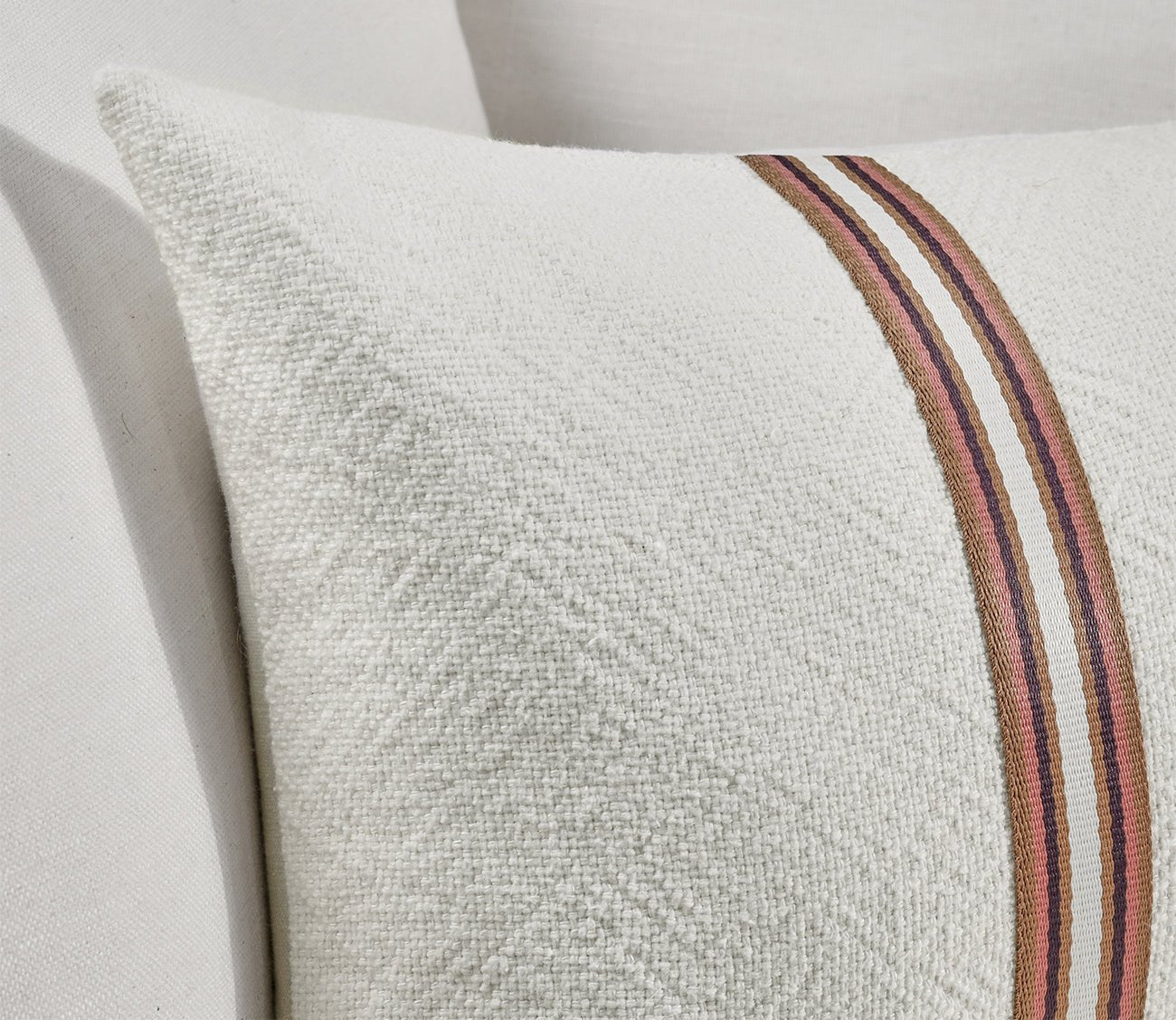 Available in a 22 x 22-inch oversized square of 14 x 26-inch lumbar size, this decorative throw pillow features a softly textured Belgian flax linen and cotton blend cover, removable with a zip closure. Polyester tape applique creates a contrast stripe design, while the included feather and down insert fills the interior with a luxurious loft.