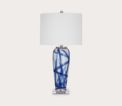 Crafted with quality as a functional and decorative piece, Bassett Mirror’s Rianna Table Lamp complements various interiors and color palettes with modern, transitional, or coastal aesthetics. Topped with a white linen drum shade that softly diffuses the light, this 28-inch-tall ceramic table lamp features an elongated white body adorned with abstract blue brushstrokes in crisscrossing directions. Complete with a clear crystal base— style this artsy lamp on a nightstand, entryway table, or credenza.