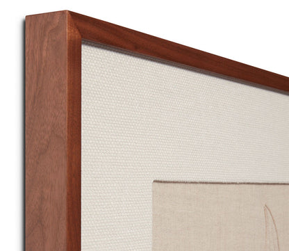 - Brown faux wood framed artwork with neutral matting and a square orientation.