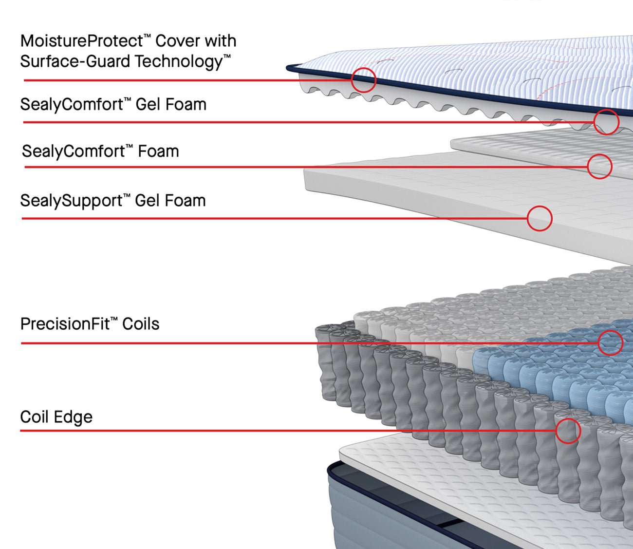 - SealySupport™ Gel Foam: Traditional gel foam that contributes to the foundational support of many Sealy® mattresses.