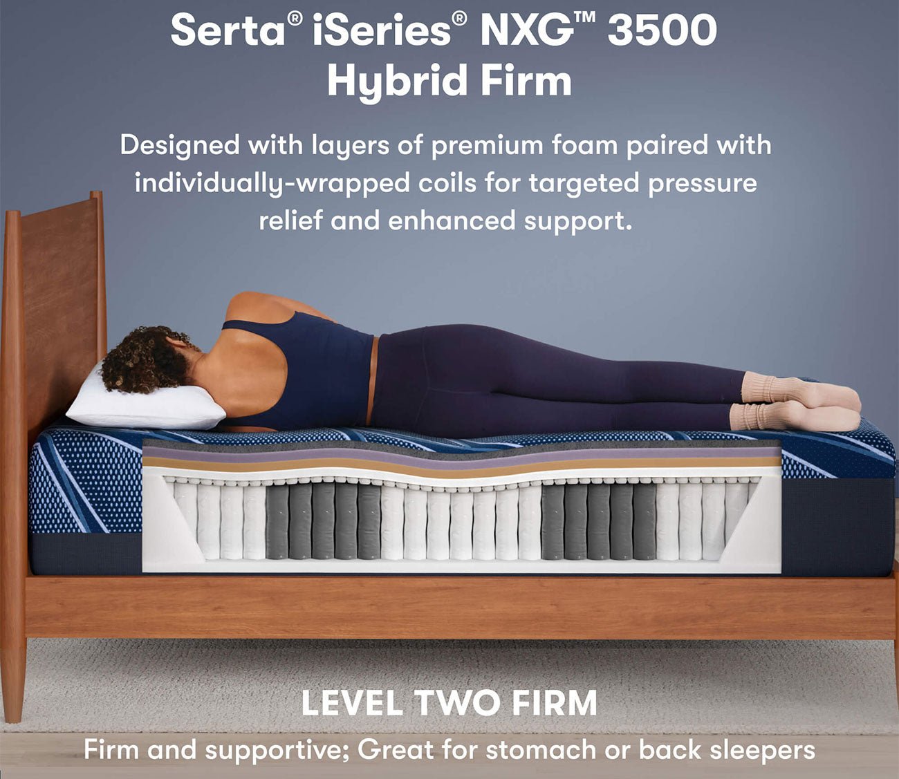 The Serta iSeries NXG 3500 Hybrid Firm mattress delivers a more robust, supportive sleep experience with enhanced height and advanced hybrid performance. Designed with a series of benefits for the sleep you want, it provides immediate cooling, deep pressure relief, and reinforced support where your body needs it most. Its firm feel offers consistent stability, while zoned coils help support proper alignment through the back and hips.