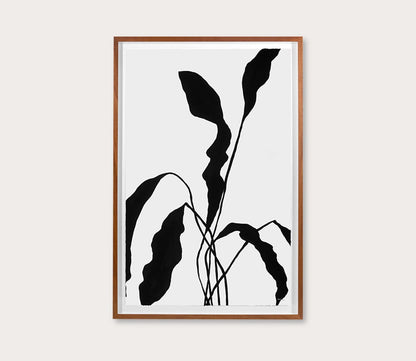 Minimal with mid-century modern appeal, this walnut wood-framed archival digital wall art print on hand-torn paper by Hable Construction displays a floral silhouette in contrasting black and white.