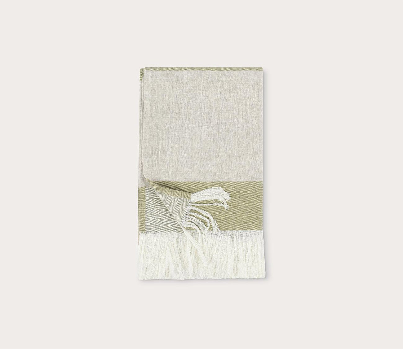 Lightly washed and pre-shrunk, this 50 x 70-inch throw blanket features breathable cotton and linen blend fabric with lightweight warmth. Available in a natural and charcoal grey or wheat green and natural color scheme— the crafted design with a pieced stripe construction provides timeless patterning with hand-knotted fringe decorating the top and bottom.
