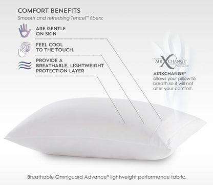 Gentle against your skin, tough on allergens— Pure Care’s Tencel™ pillow protector designed with cooling and smooth materials provides a healthier sleep environment. Comfortably fitting any pillow type, the clinically proven performance fabric offers a luxurious cool-to-the-touch feel and sophisticated microfiltration technology. The MiteTight® seams and locking zipper coupled with antimicrobial treatment inhibit spills, moisture, dust mites, and bed bugs from accessing your pillow.