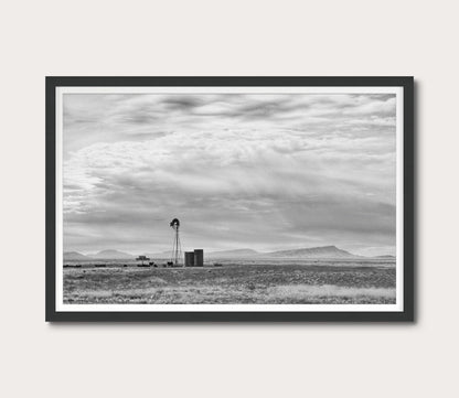 Accent your walls with the wide-open, quiet beauty of Grand Image's The Windmill Digital Fine Art Print by gifted photographer Jean Cornell. Equally captivating and calming in a greyscale palette, this 30 x 45-inch photographic wall art print on archival paper conveys the serenity of Texas' desolate countryside, depicting a black and white landscape and distant windmill. This ready-to-hang piece arrives matted in white and set within a black frame under protective glass for a finished look.