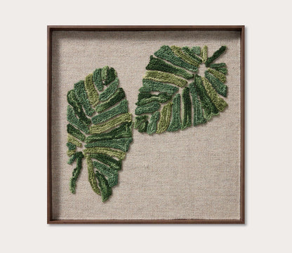 Transform your space with the urban jungle aesthetic of Loloi’s Tongass Framed Textile Wall Art, featuring exquisite texture and bold botanical design. Available in a 25 x 25-inch size with a square orientation, this wall décor accent piece showcases a neutral ivory woven wool ground with dimensional yarns in a variegated green palette that forms two tropical palm leaves. Complementing a boho, beachy, or coastal interior— the high-quality artwork arrives ready to hang in a rich walnut wood frame with attached hardware.