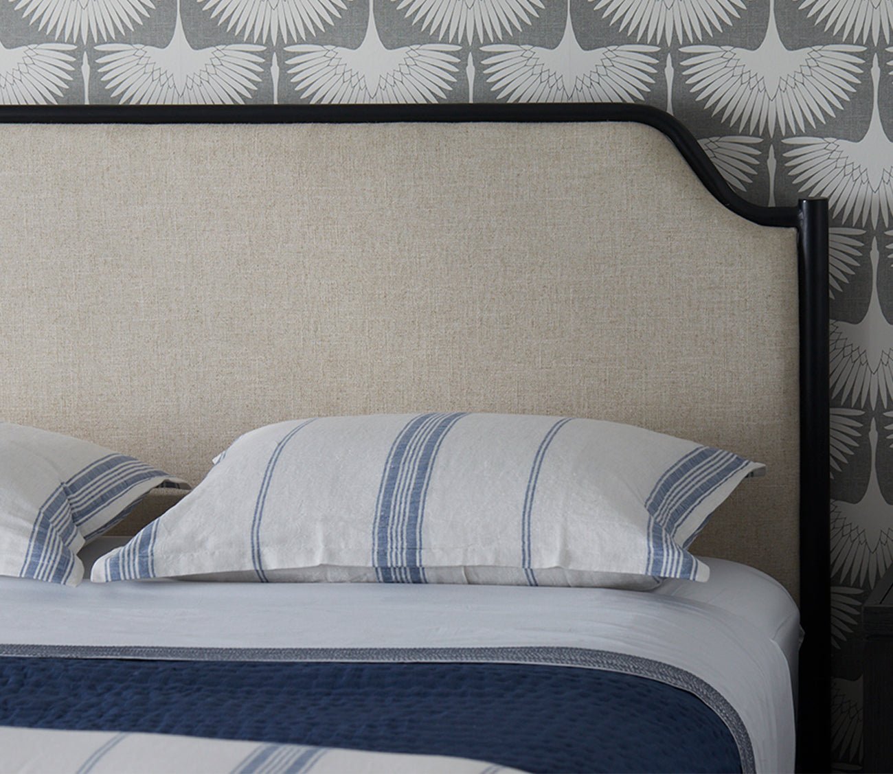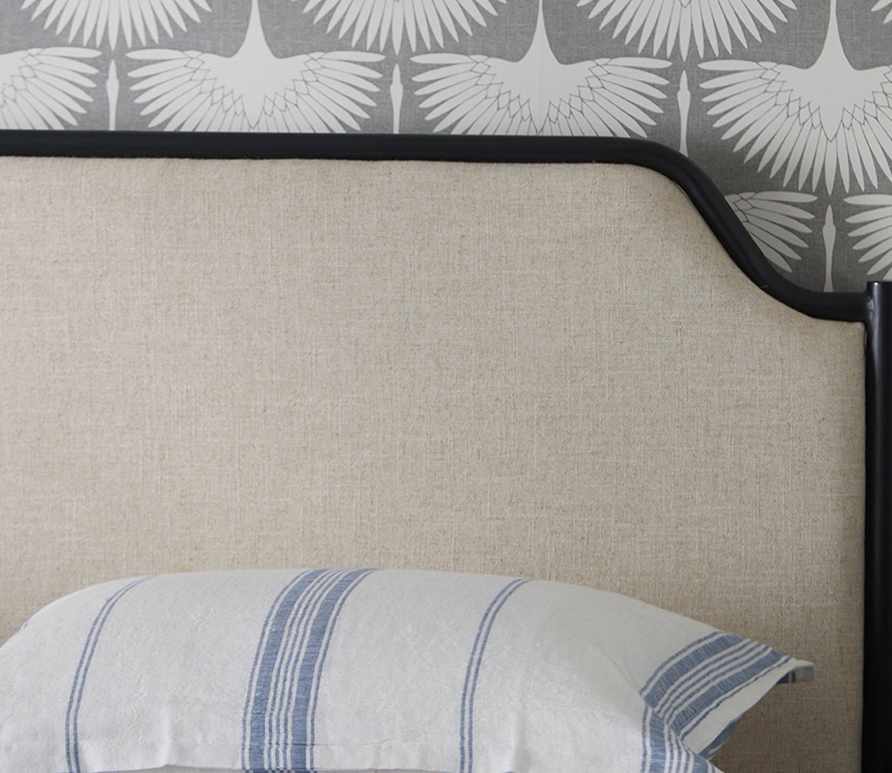 - Headboard and footboard with a gently sloping arch design and natural linen fabric upholstery.