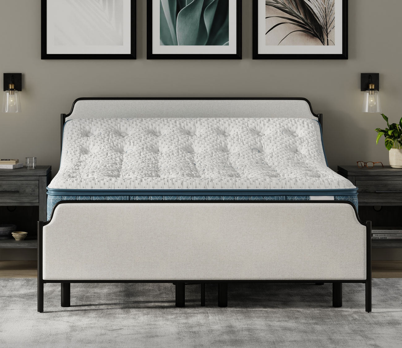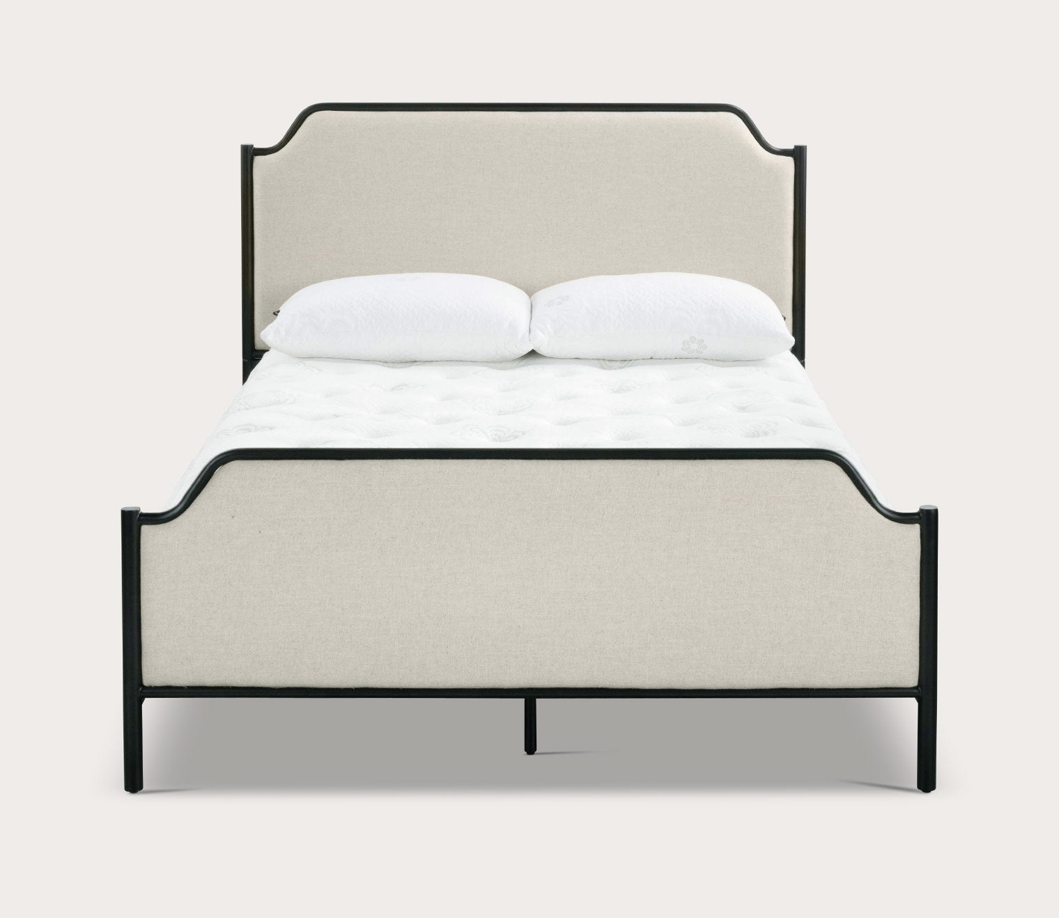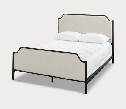 A perfect mix of classic styling and modern details— our CM Home™ Alyssa Upholstered Metal Bed makes an eye-catching and well-crafted focal point in a primary bedroom suite or guest room. With a graceful arch of the frame and delicately notched accents, this black metal bed features an elegant headboard and matching footboard with performance-treated beige linen fabric upholstered panels and a touch of cushioning for extra comfort. Durably engineered for lasting support, the mixed material design includes matte black finished metal for elevated contrast.
