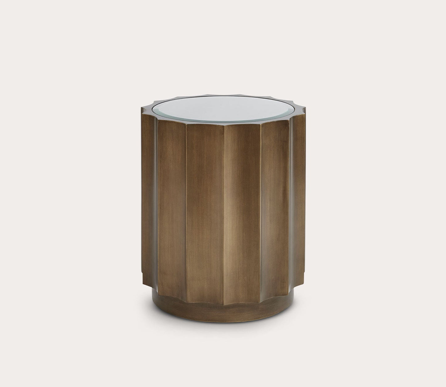 - Glass top bronze drum end table with scalloped edge