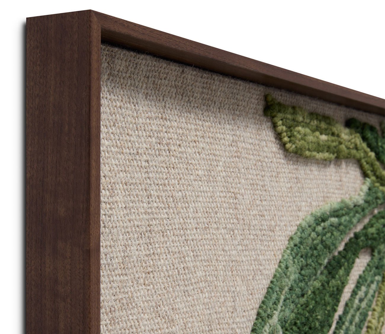 Set against a warm flatwoven base in versatile taupe, this wall décor accent piece flaunts thick wool yarns looped into tropical leaf designs with variegated green shades. Fitting interior themes from coastal, mid-century modern, bohemian, and beyond— the high-quality artwork arrives finished and ready to hang in a walnut wood frame.