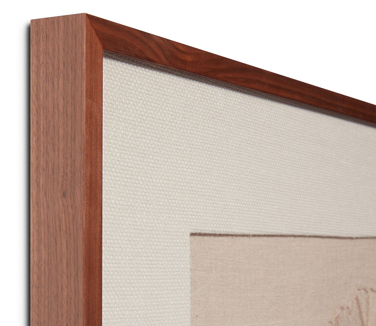 Available in a 36 x 36-inch or 20 x 20-inch size with a square orientation, this wall décor accent piece features beige flatweave fabric embroidered with a timeless leaf motif, surrounded by a natural-toned mat with complementary texture. An effortless addition on its own or paired with a gallery arrangement, the high-quality artwork sits in a rich walnut faux wood frame and arrives ready to hang.