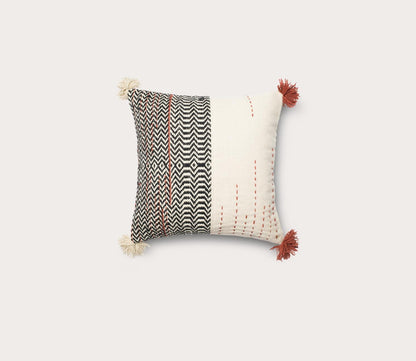 Bring whimsical and fun style to your sofa or favorite accent chair by layering on Loloi’s Woven Wool Throw Pillow, including a huggable polyfill insert. With oversized 22 x 22-inch square dimensions and a high-quality design, this decorative toss pillow features a removable cover with a wool front and cotton reverse in a black and white palette with warm orange-hued touches. Detailed by corner pom-pom tassels— the geometric tribal-style pattern on one side is offset by the dash stitching on the opposite.