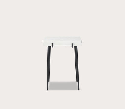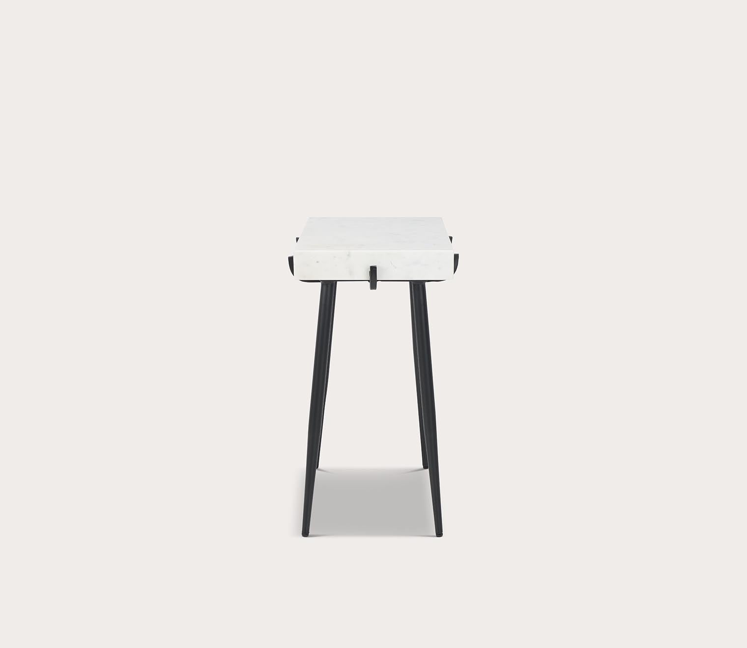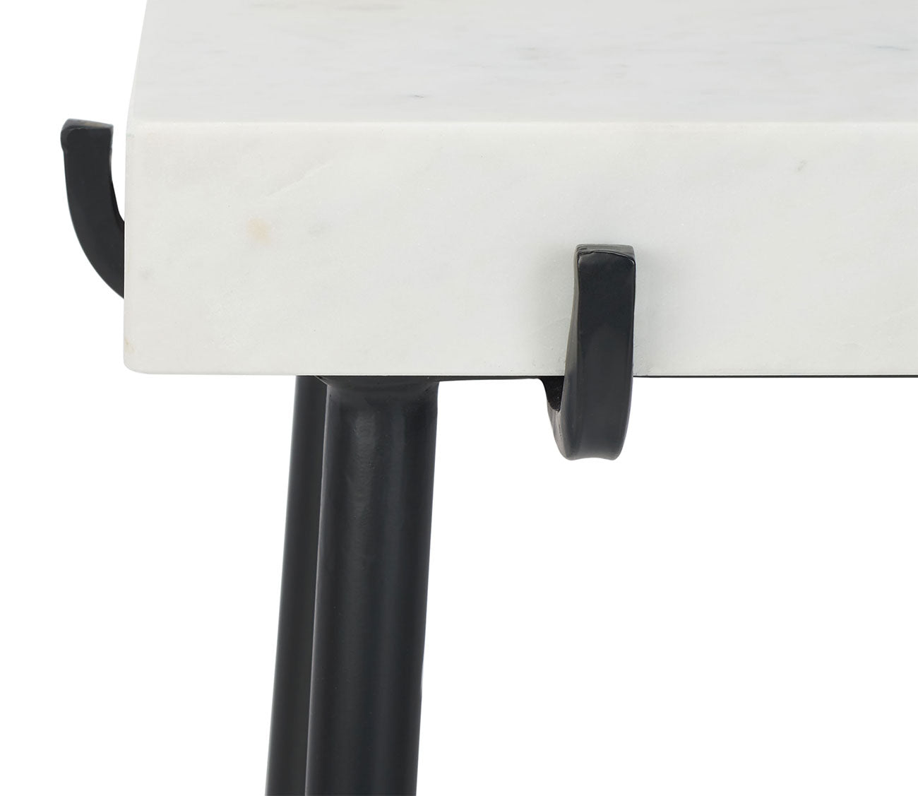 - Angled black metal legs topped with white marble.
